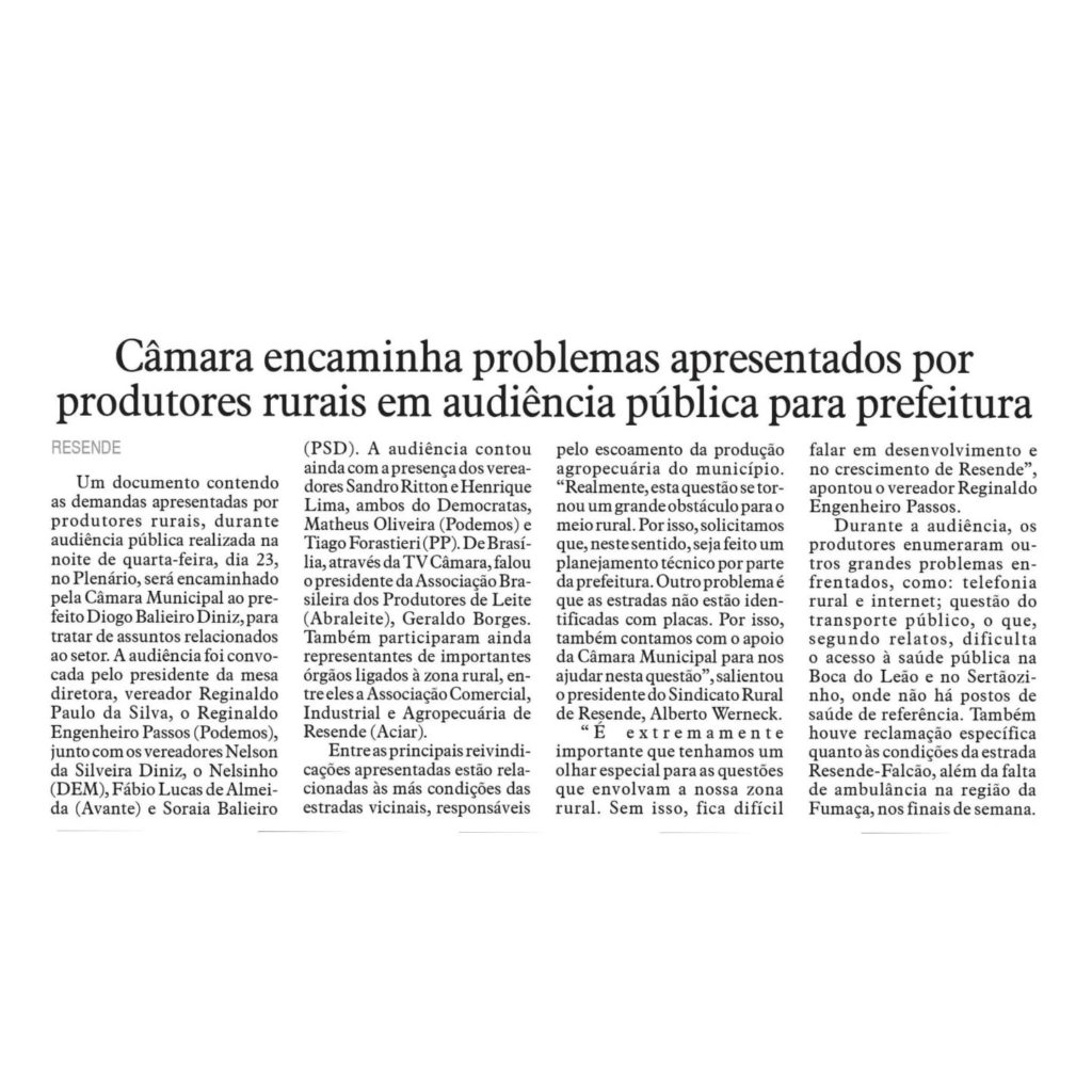 Realizamos a 1ª Audiência Pública voltada para assuntos rurais do município; essa foi a 1ª etapa de ações de valorização e de auxílio aos moradores e produtores das zonas rurais de Resende.A audiência realizada só veio agregar e fortalecer a nossa união. Precisamos, cada vez mais, unir nossas forças para que juntos, possamos sanar as demandas e proporcionar uma melhor qualidade de vida a todos os moradores da zona rural e sitiantes! Todas as questões levantadas estão em ata e prontas para serem trabalhadas, além de serem encaminhadas para o Executivo Municipal.Meus sinceros agradecimentos aos representantes das instituições convidadas, aos nobres pares e, em especial, a todos os moradores das áreas rurais de Resende e de outros estados, que vieram de longe expor seus problemas e necessidades, a presença de cada um foi imprescindível.Que possamos entender a importância desses produtores que produzem o que nos alimenta, da hora em que acordamos até a hora em que vamos dormir, e que a valorização de cada um deles seja da mesma proporção do bem que eles nos oferecem com suas produções.
