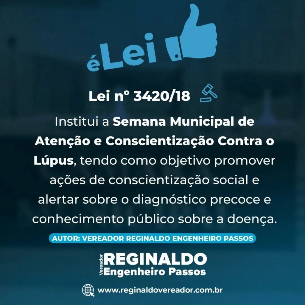 - Sou autor da Lei que institui no município a Semana Municipal de Atenção e Conscientização contra o Lúpus, o mês de maio é chamado de Maio Roxo, para chamar a atenção para essa importante causa.