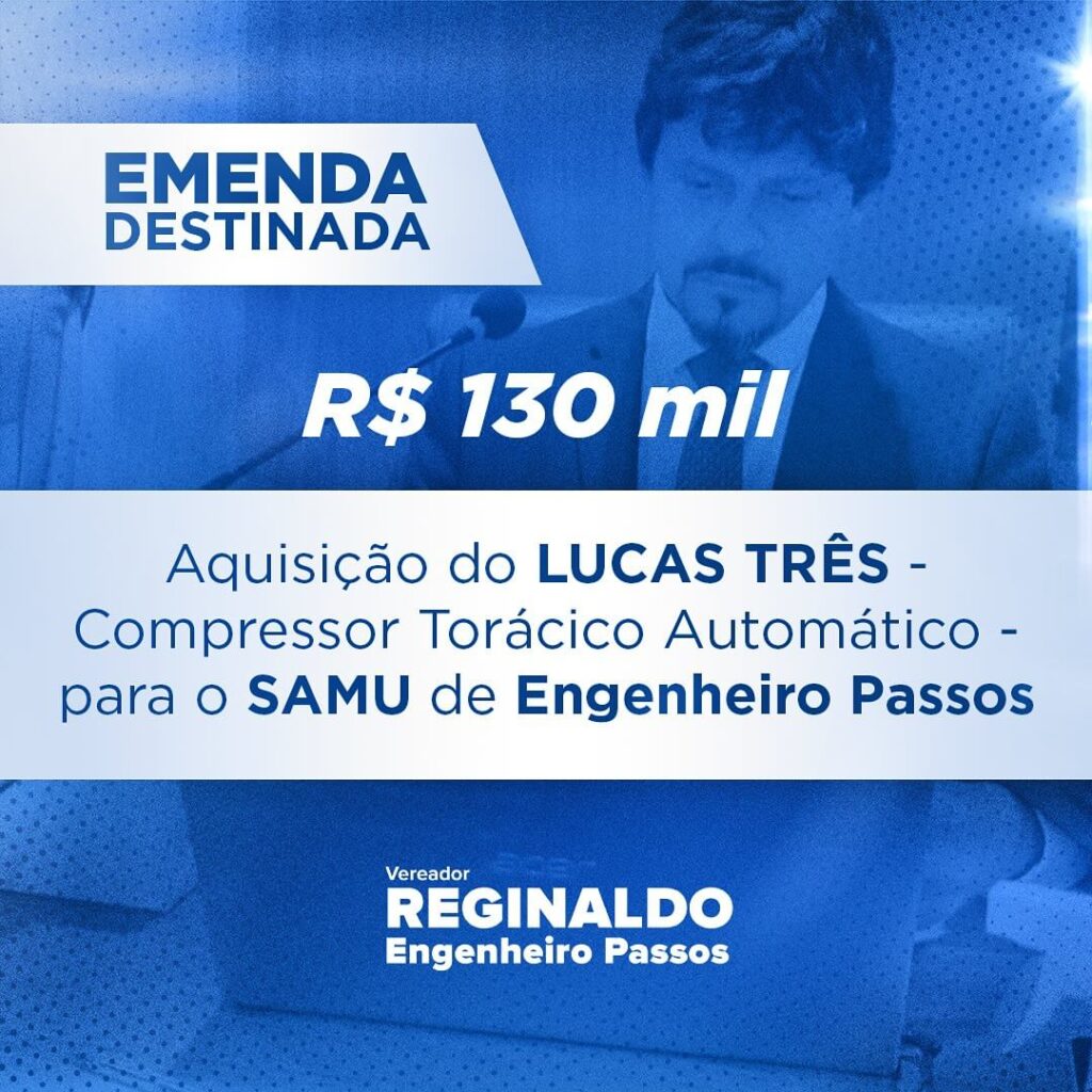 - Destinei, em emenda impositiva, 130 mil reais para a aquisição do LUCAS – compressor torácico para a ressuscitação cardio pulmonar RCP para o SAMU de Engenheiro Passos.
