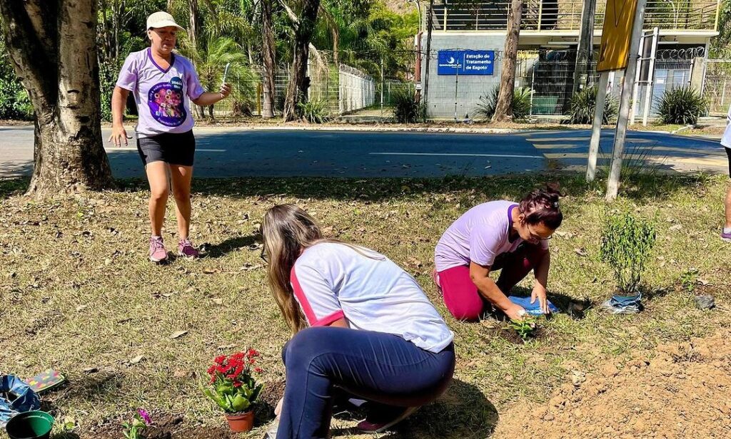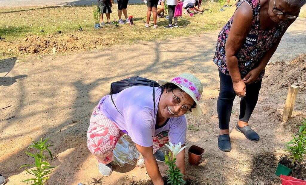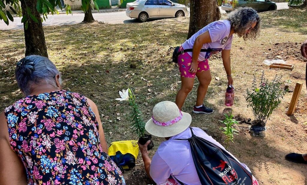 • Eu e as meninas do projeto da Melhor Idade, juntamente com a Dani, que organizou e mobilizou a ação, plantamos flores ao longo do caminho que nos leva da BR à entrada da Cohab.