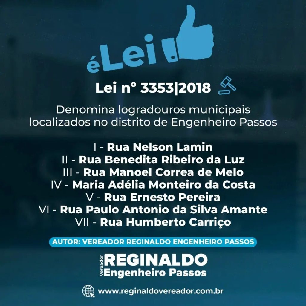 •  A lei nº3353/18 de minha autoria, denomina nomes de ruas em nosso distrito. Algumas ruas de Engenheiro Passos que, antes não eram denominados, hoje possuem nomes que, além de facilitar o reconhecimento das ruas, homenageiam pessoas que fizeram parte da história do distrito.