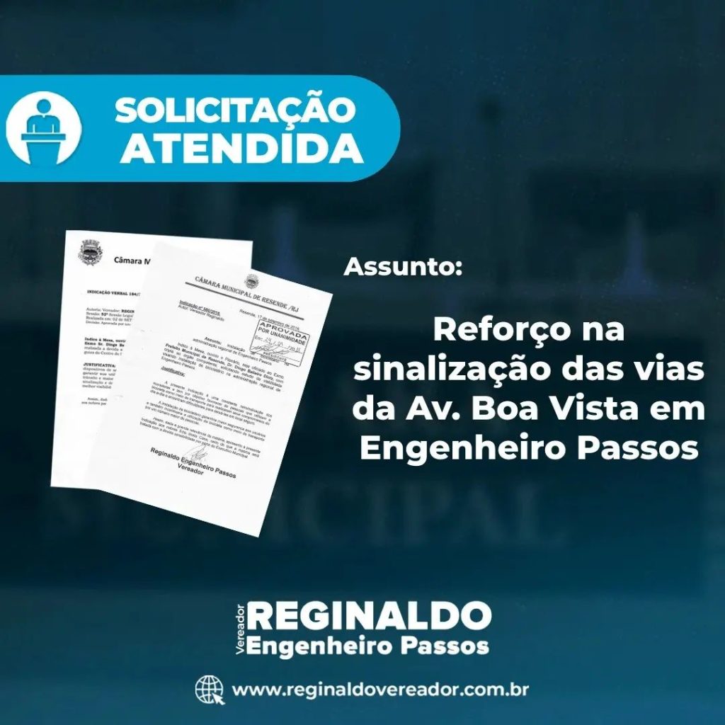 • Solicitei o reforço da sinalização viária da Av. Boa Vista em Engenheiro Passos, pois além de ficar mais apresentável, a sinalização viária direciona e guia os motoristas nas práticas de dirigibilidade e possibilita a visualização diurna e noturna, promovendo mais segurança para os veículos e pedestres.