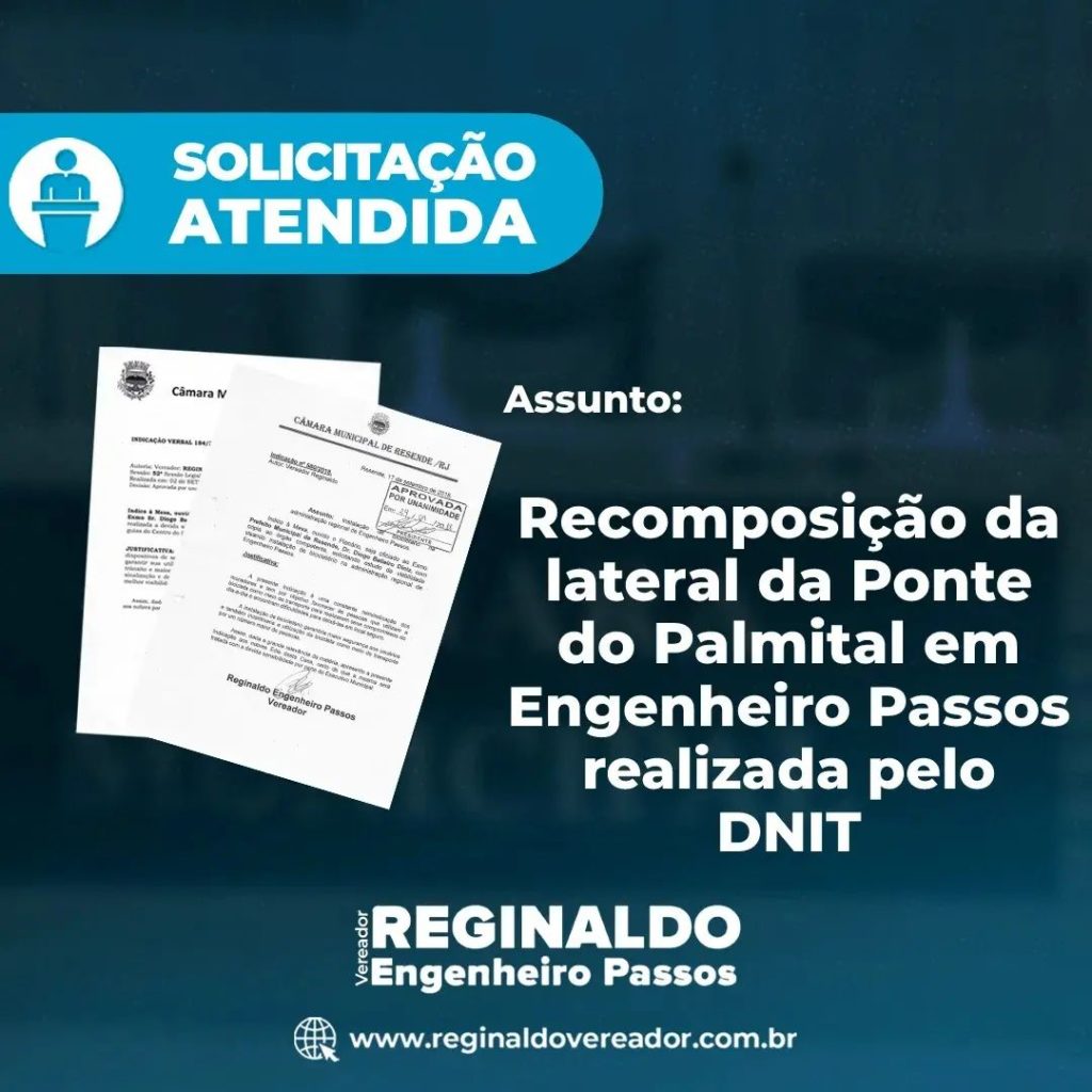 • Mais uma solicitação sendo atendida, dessa vez, a manutenção é na Ponte do Palmital em Engenheiro Passos. O DNIT está fazendo a recomposição da lateral da ponte, promovendo a segurança de todos que ali trafegam, infelizmente a ponte apresentava muitos riscos. Gostaria muito de agradecer ao meu nobre amigo Tomé, que prontamente atendeu nossa solicitação junto ao DNIT e parabenizar toda sua equipe pelos excelentes trabalhos e pela parceria. Juntos somos mais fortes!!