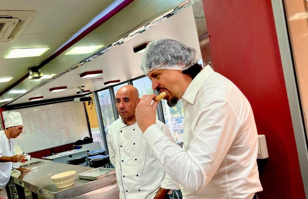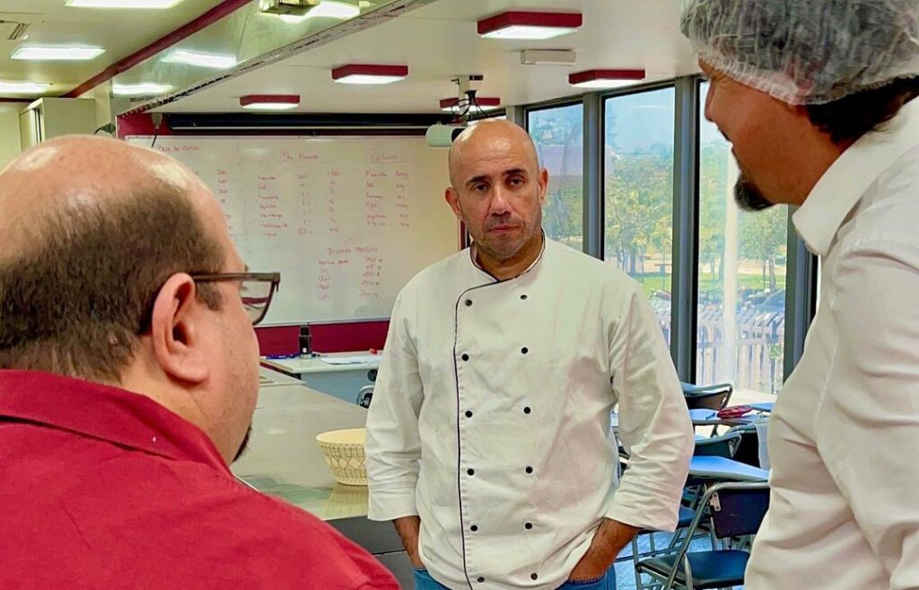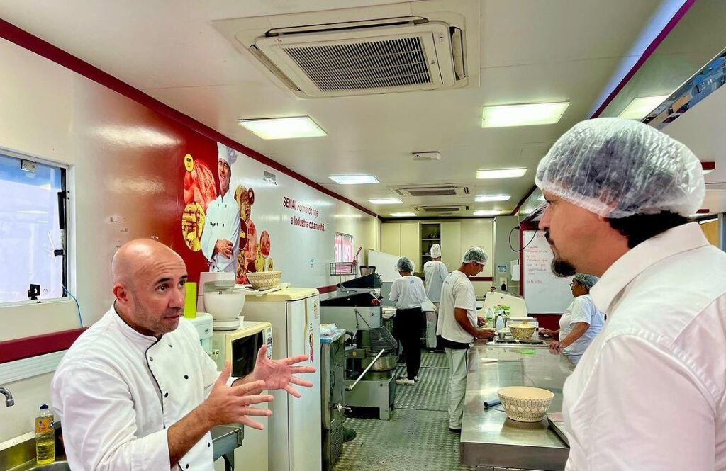 Pude conhecer a “sala de aula” itinerante, dentro de uma carreta móvel, a qual é realizada o curso de Padeiro, onde qualifica o aluno na área com competências para a produção de produtos de panificação, como pães, bolos, broas, panetones – massas doces, salgadas, finas, entre outros. Aproveitei e experimentei uma broa de coco, fresquinha produzida pelos alunos, sob o olhar atento do professor-chefe de cozinha. Estava uma delícia! 😋