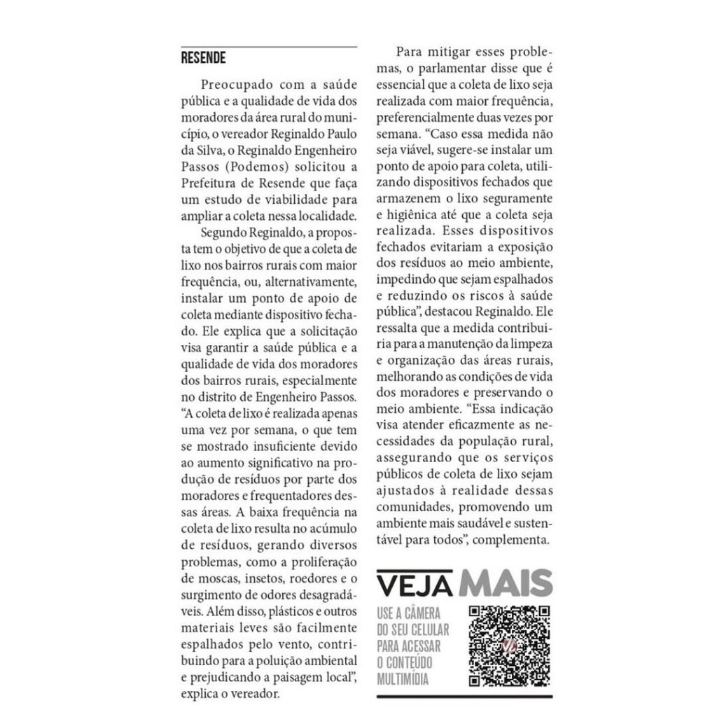 Dessa vez, realizei uma indicação para que a coleta de lixo nas áreas rurais seja ampliadas, pois percebo e sei da necessidade de se ter uma coleta de lixo regular.